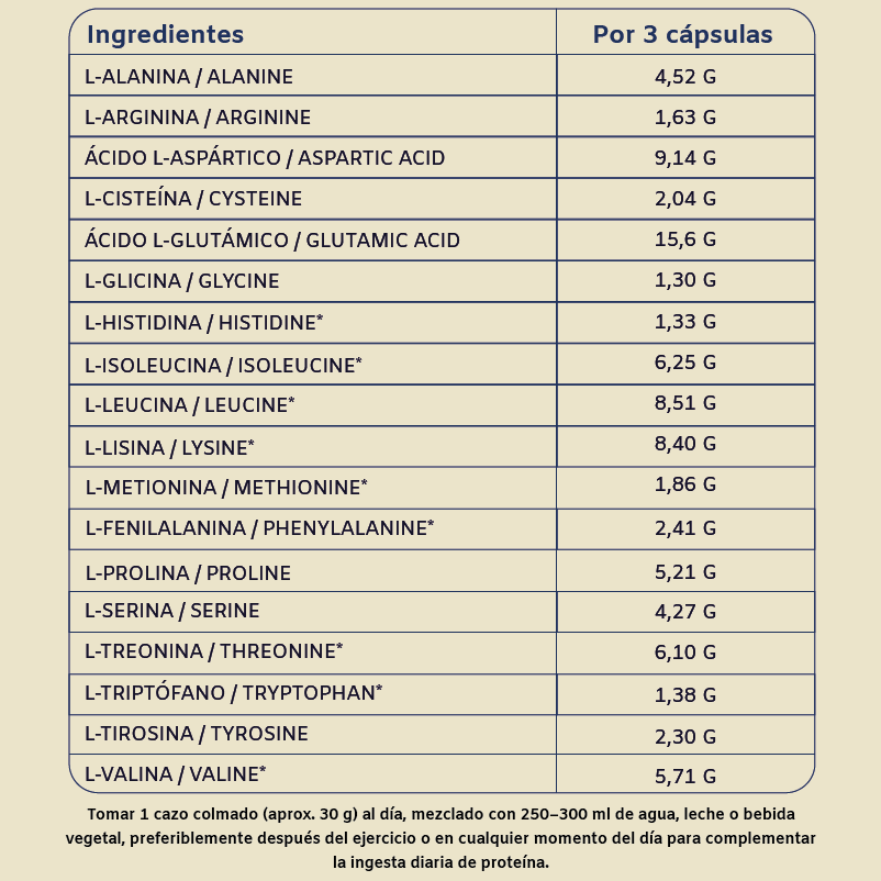 Rico en BCAA esenciales (leucina, isoleucina y valina).