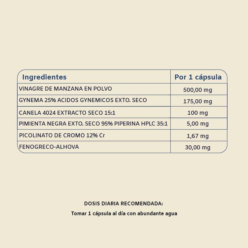 Con ingredientes clave como gymnema sylvestre, canela, fenogreco, vinagre de manzana y picolinato de cromo, seleccionados por su evidencia en control glucémico y metabolismo de la glucosa.